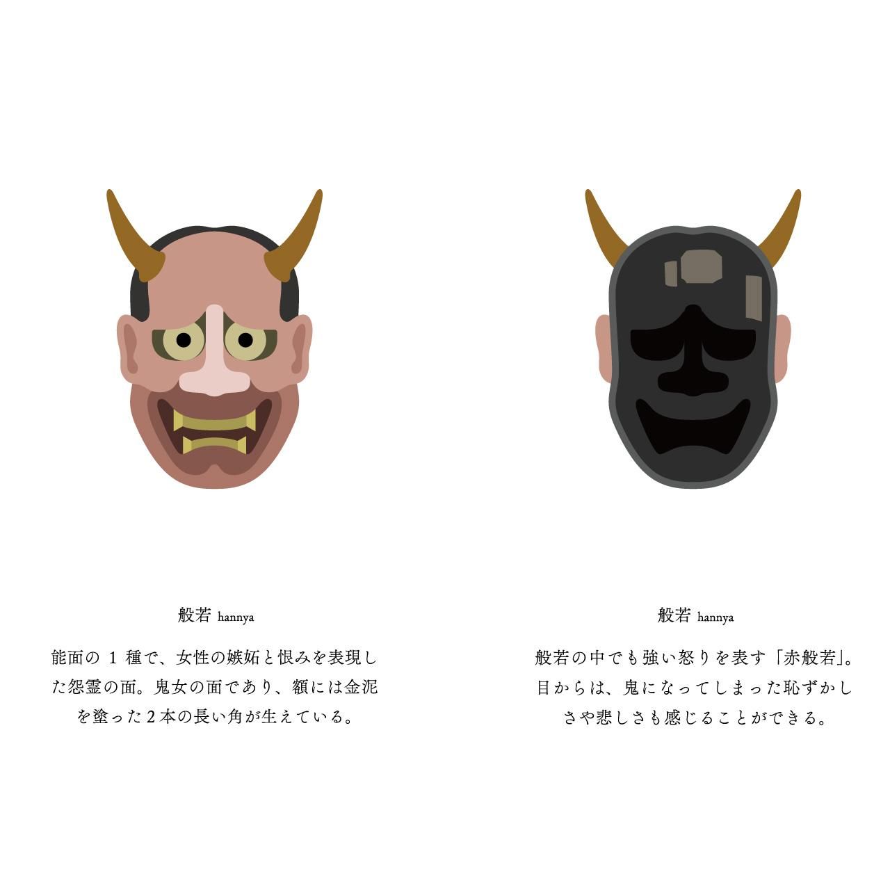 A type of Noh mask that represents a woman's jealousy and resentment. It is a mask of a demon woman, with two long horns on her forehead painted with gold paint.