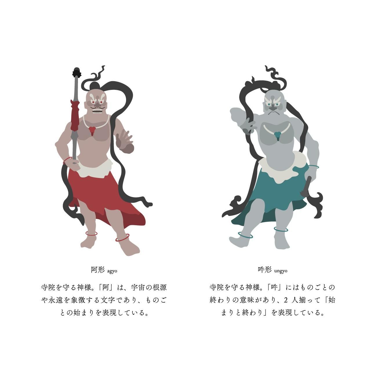 寺院を守る神様。「吽」にはものごとの終わりの意味があり、2人揃って「始まりと終わり」を表現している。
