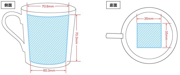 【転写位置】カップ側面 上横辺約70mm下横辺約60mm×高さ80mm、カップ底面直径約50mm